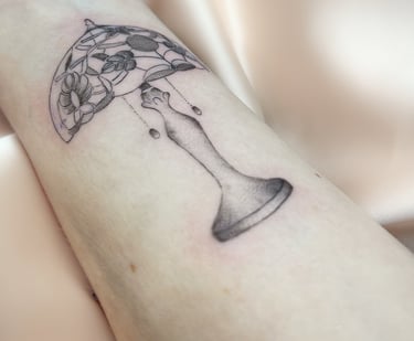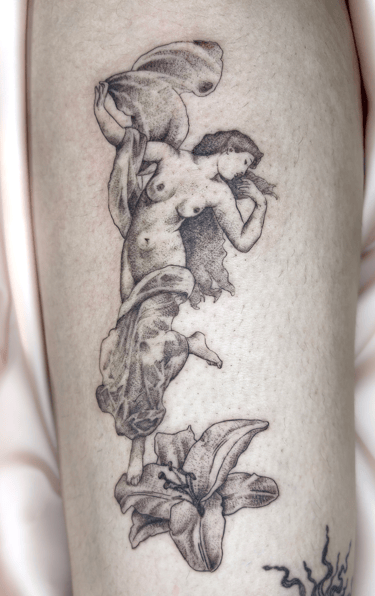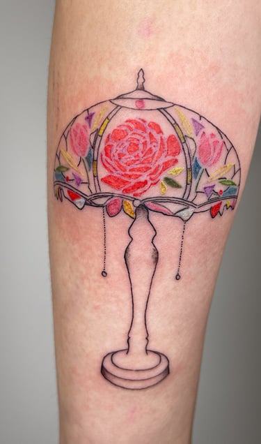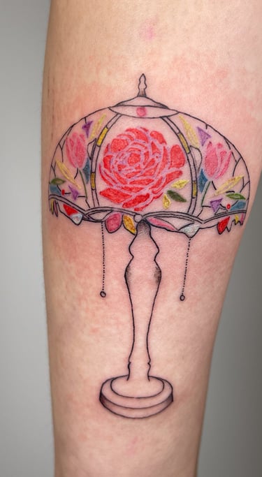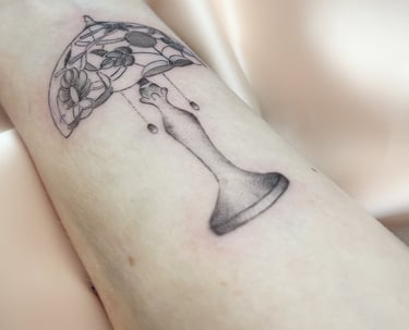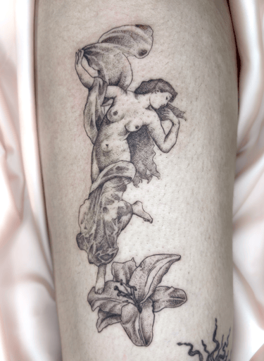 Concernant mon style, j'aime m'inspirer de tableaux, d'anciennes gravures, statues ou illustrations pour réaliser vos tatouages. Ce que j'aime par dessus tout encrer sur vos jolies peaux, ce sont des grosses pièces en semi réalisme ou de petites et moyennes lampes Tiffany qui sont, pour moi, l'incarnation parfaite de la préciosité !